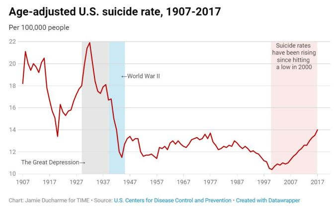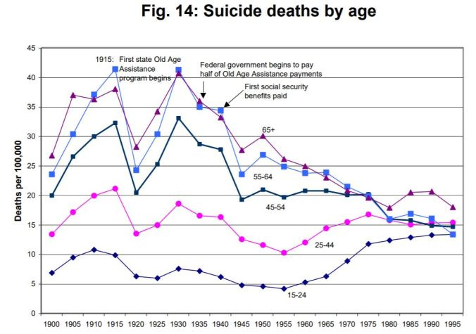 Although he does not make this explicit, Sean Last seems to think that the suicide rate changes in the elderly are driven by finances, while the rates in the youth are driven by unhappiness. An alternative hypothesis is that life is getting worse for the youth and better for the elderly, even beyond finances. A lot of things that have worsened over time (e.g. dating, political culture, education) are things that primarily affect younger people, while things that have gotten better (e.g. health) are things that are more important for older people.