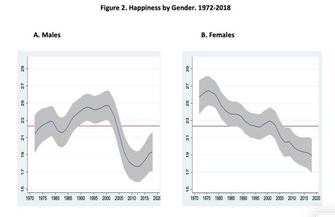 The good news is, per those charts, male and female happiness have finally reached a state of perfect group equity.