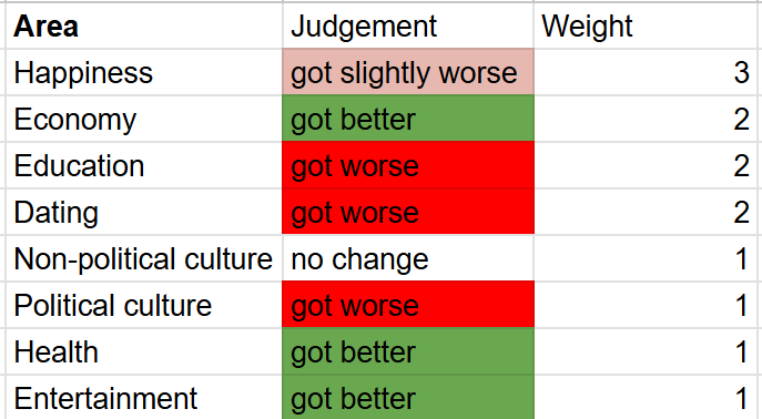 As such, when evaluating the quality of a society over time, other variables need to be assessed beyond the economy, such as happiness, the education system, dating, culture, politics, health, and entertainment. In order of importance: