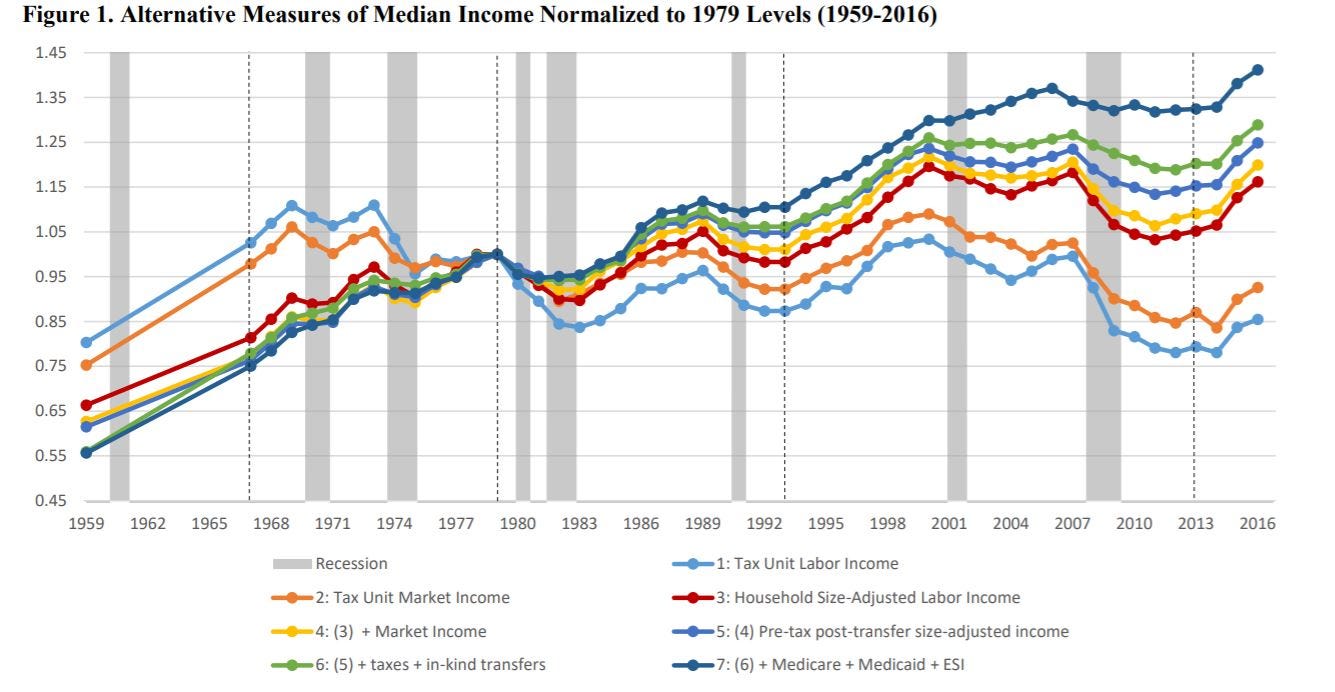 …Unless one accounts for household size, tax transfers, and government transfers. I assume that people would rather earn $40k through their own labour than $40k through the government, but, as the saying goes, 20 dollars is 20 dollars. This increase also cannot be blamed on changes in working hours, as Americans work less hours today than they did in the past.