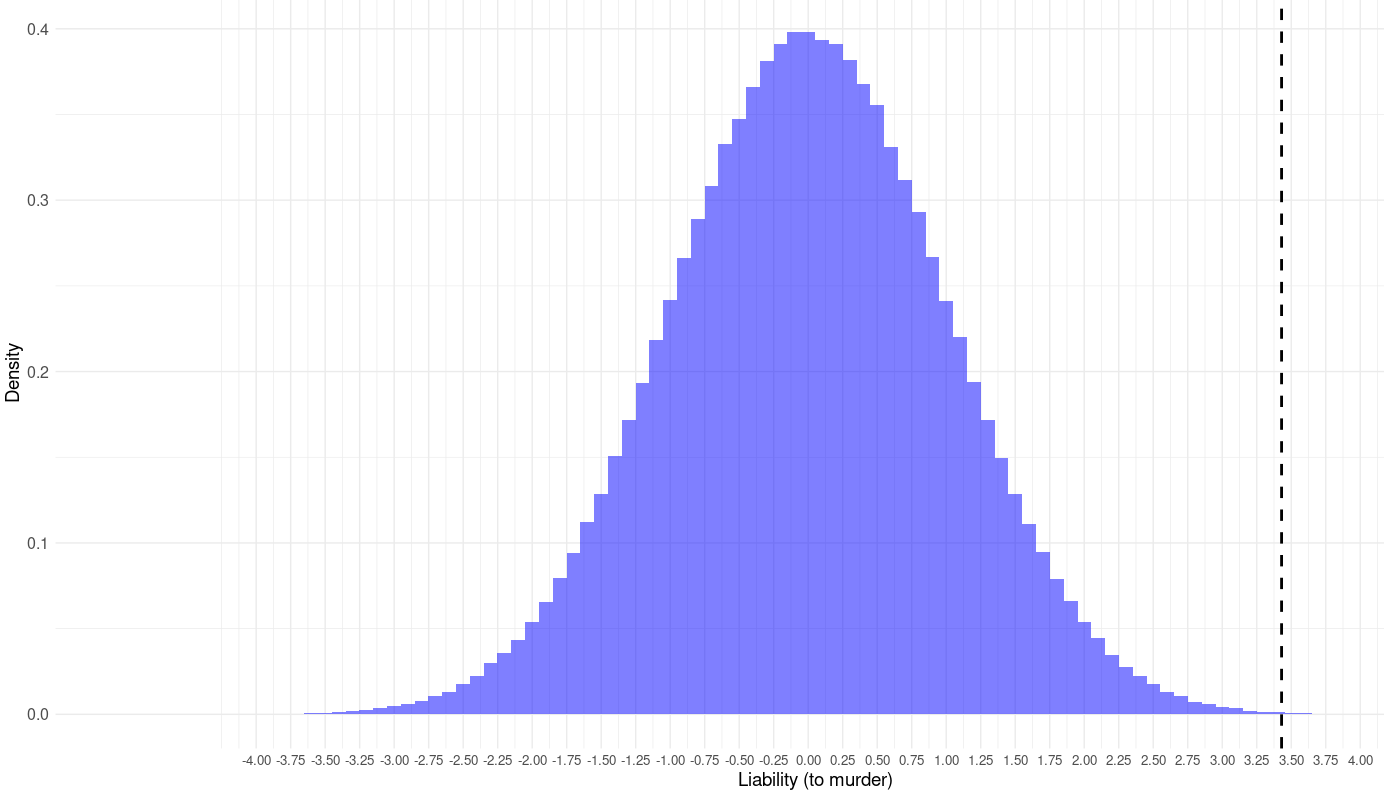 Given that the homicide rate in England was about 30 per 100,000 in the 1300s, liability to committing homicide (again, both genetic and environmental) can also be hypothesized to be gaussian with a reference mean of 0 and standard deviation of 1 in 1300. If 30 per 100,000 people committed homicide per year, then the threshold at which people commit murder is 3.43 SD above the trait mean.