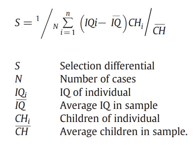 There are two ways to calculate selection differentials with real data: the slope/intercept formula (regress a standardized trait onto fertility using linear regression and dividing the slope by the intercept) or the complex formula that people in the population genetic community say looks clunky. But when I saw the complex formula I was able to finally intuitively understand what the statistic actually is trying to do.