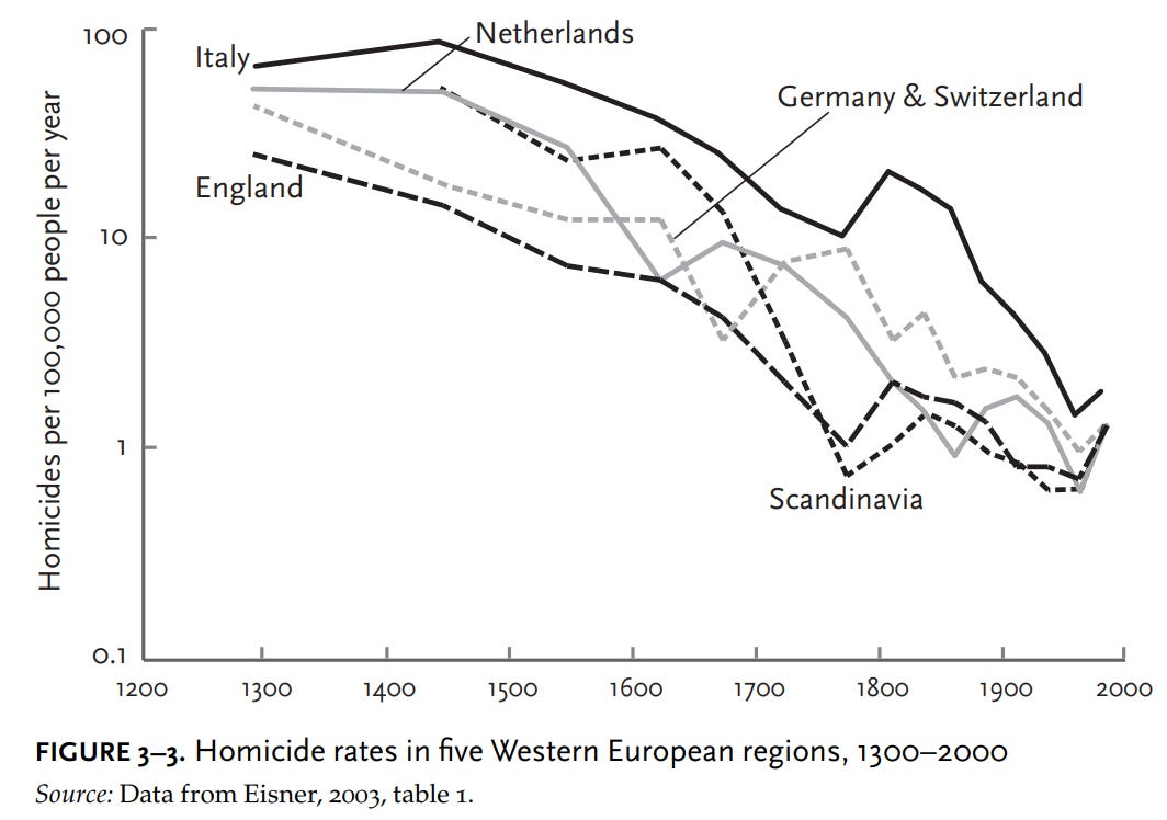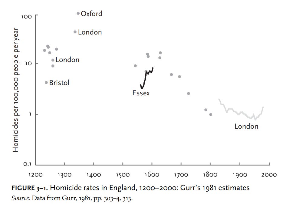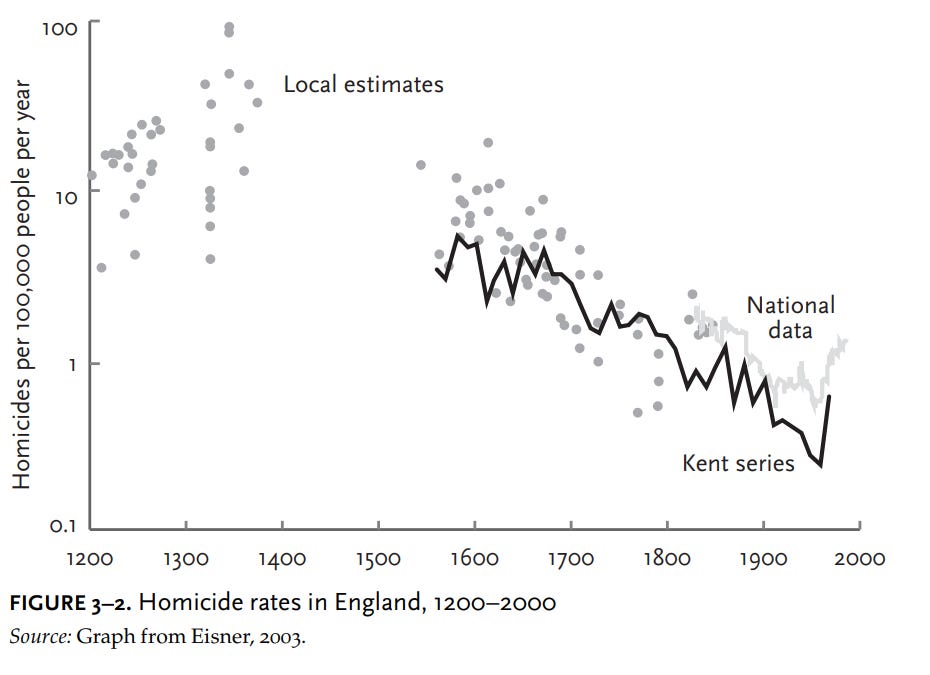 Statisticians and historians such as Steven Pinker have noted that homicide rates have declined in England since the Medieval period: