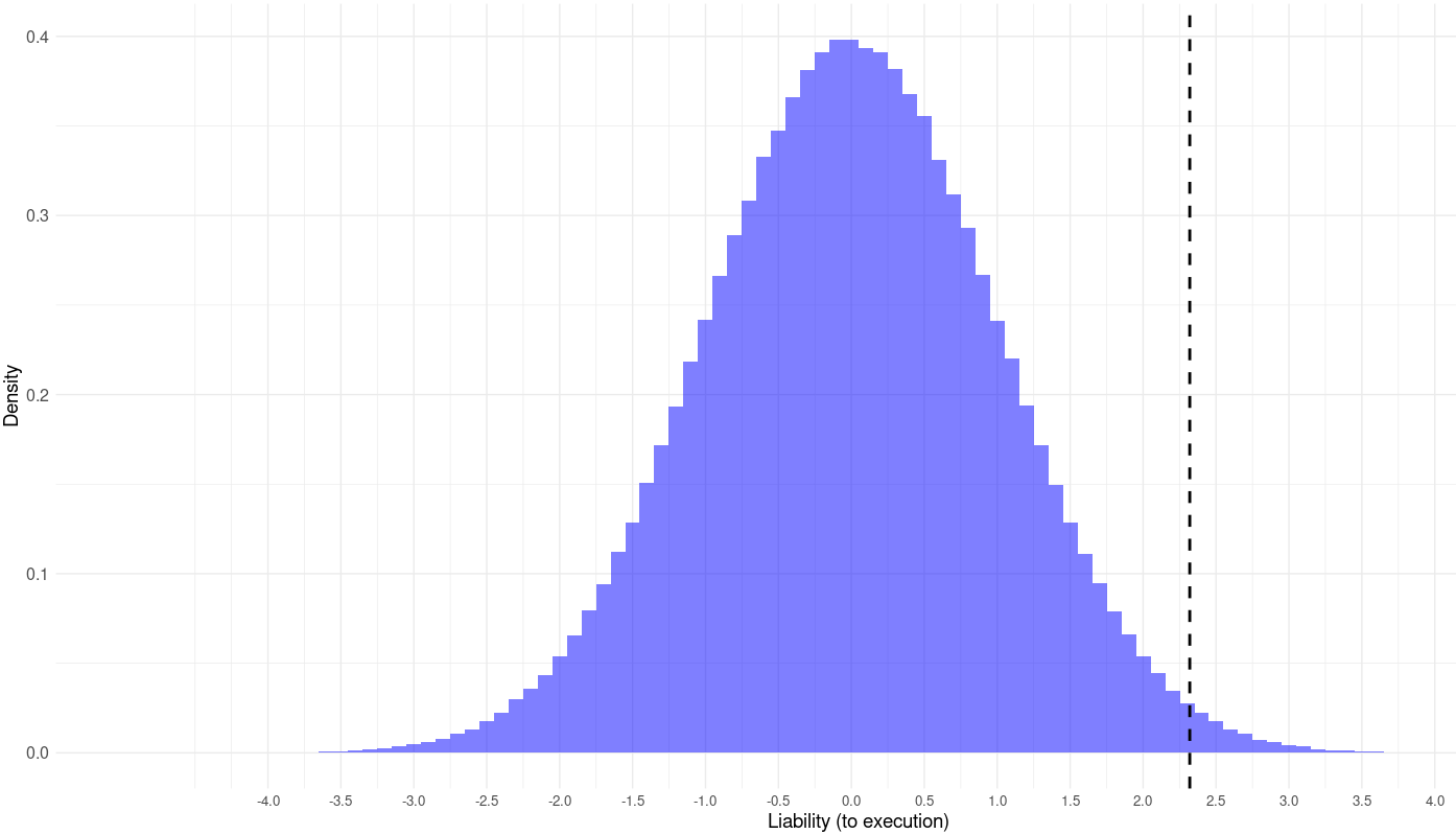 Under the bell curve model, the average ‘liability to being executed’ of those who are executed is 2.65, while the liability within those who are not is -.027.