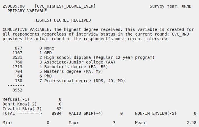 To test whether the formula works, I used real data: fertility and intelligence in the NLSY97 cohort. I dichotomized the intelligence variable to intelligent (IQ > 100) and unintelligent (IQ < 100) and restricted the sample to individuals over 35 years of age. Using the formulas I described earlier, the difference between parents and non-parents weighted by number of children is 2.48 points when intelligence is dichtomoized (It’s 2.88 when it is a continuous variable).