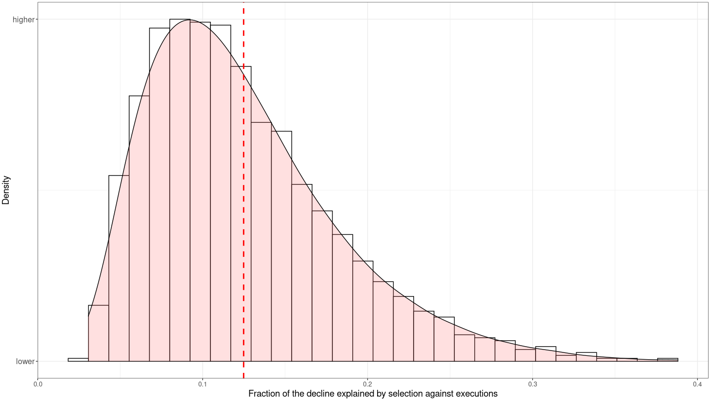 TL;DR: selection against being executed can explain roughly 11.4% (95% credible interval: [5.2%, 23.4%]) of the decline in homicide rates in England that occurred between 1300 and 1700.