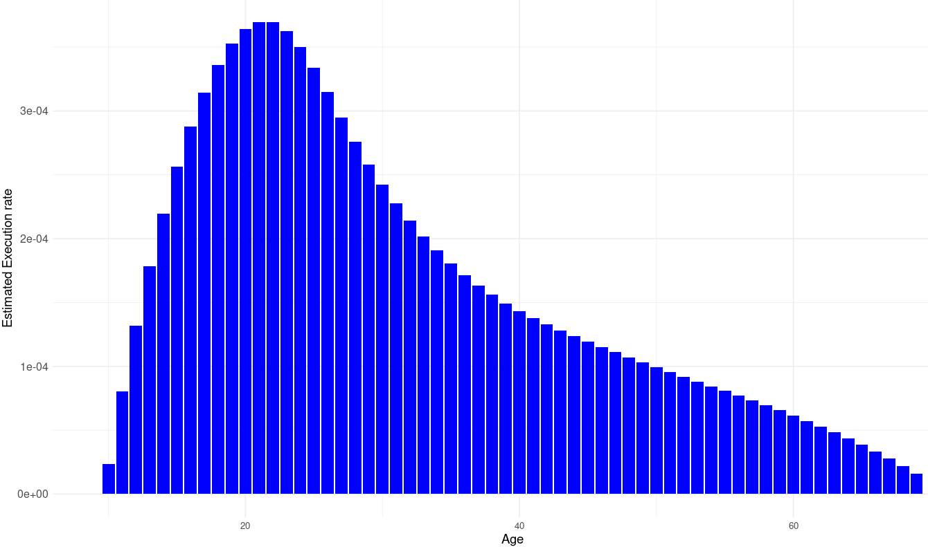 [1] -0.02673942Assuming that the execution itself has no bearing on whether their children survive relative to the rest of the population, then the number of children an executed person bears can be estimated by taking the average number of expected of children weighted by the execution rate by age (which is estimated with the age-crime curve). As it’s unlikely that children under 10 will either bear children or be executed, they were ignored in the modeling process. Ages above 70 are also unmodeled.
