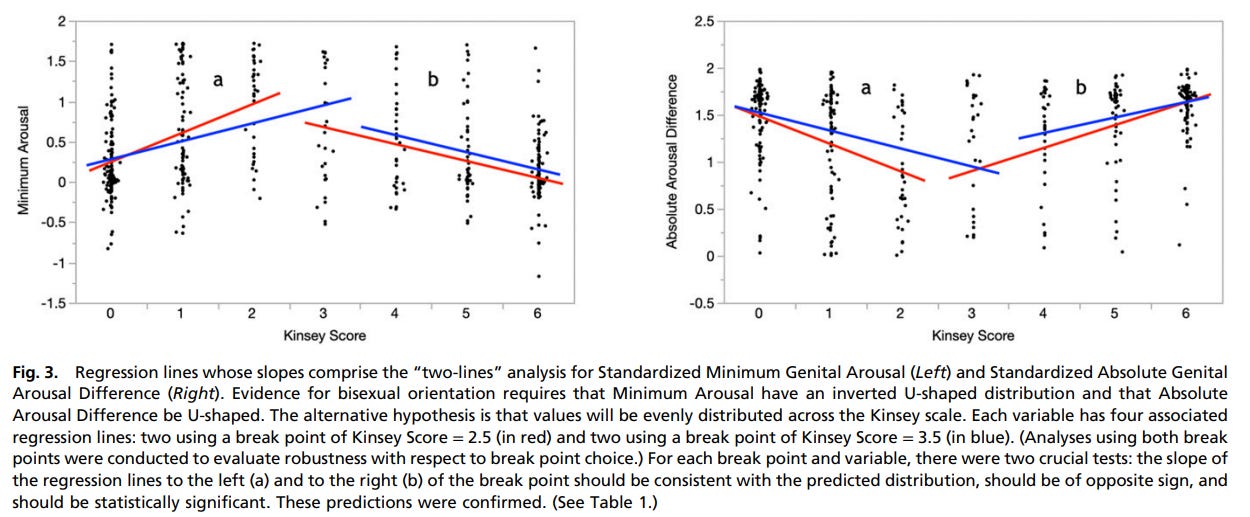 Theoretically, if sexual orientation within men were really bimodal, then the attraction people feel towards the sex they are less interested in would be the same regardless of their kinsey score. If it was continuous, then attraction to the less arousing sex would follow a U curve.