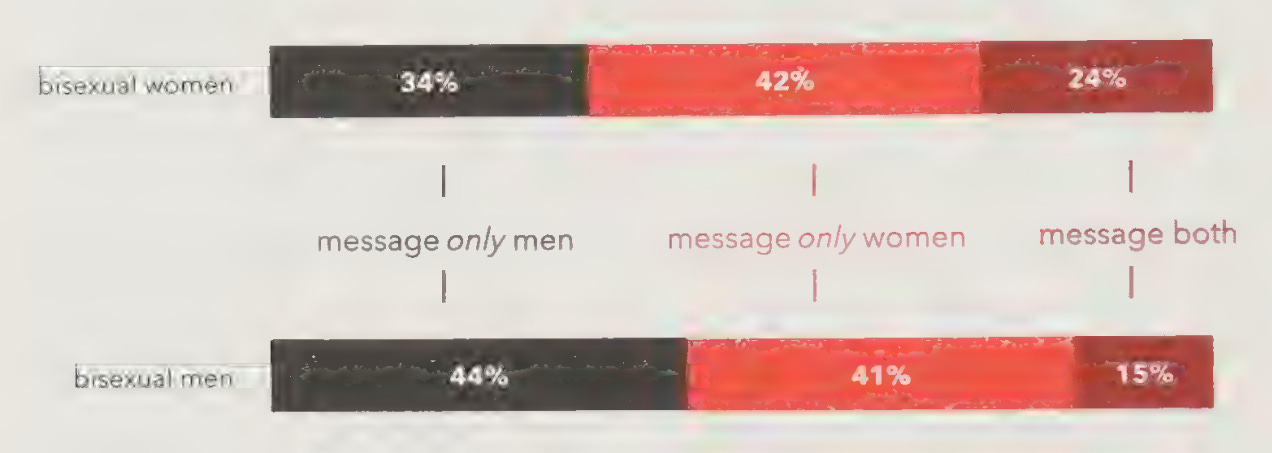 Looking at the low percentage of bisexuals messaging both sexes I'd wager that there is a noticeable amount of effort in trying to maintain active courtship with both sexes. I can notice something like this in myself as a bisexual man. There's difference (while still some decent overlap) in the mental frameworks I use when approaching women vs men