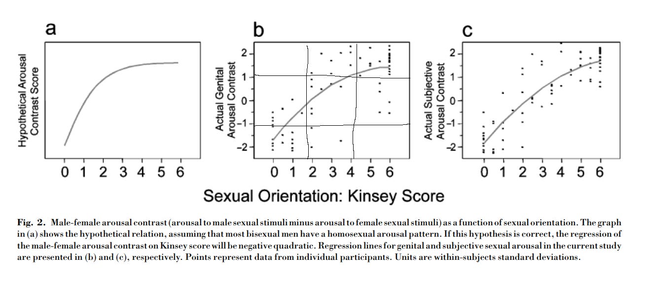 There’s a large discrepancy between self-reported and measured genital arousal: about half of “straight” men are functionally bisexual, half of bisexual men have genital arousal patterns that mimic those of either straight or gay men, and about 25% of gay men have bisexual arousal patterns. There are two ways to intepret this: that people have different ways of interpreting their sexuality (mental vs physical arousal), that they do not accurately report their sexuality, or that people’s reactions to short pornography videos can vary based on temporal factors or content.