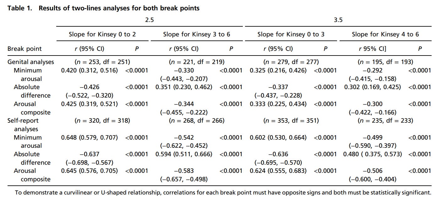 Consider the relationship between self-reported sexuality on the kinsey scale and genital arousal (male - female):