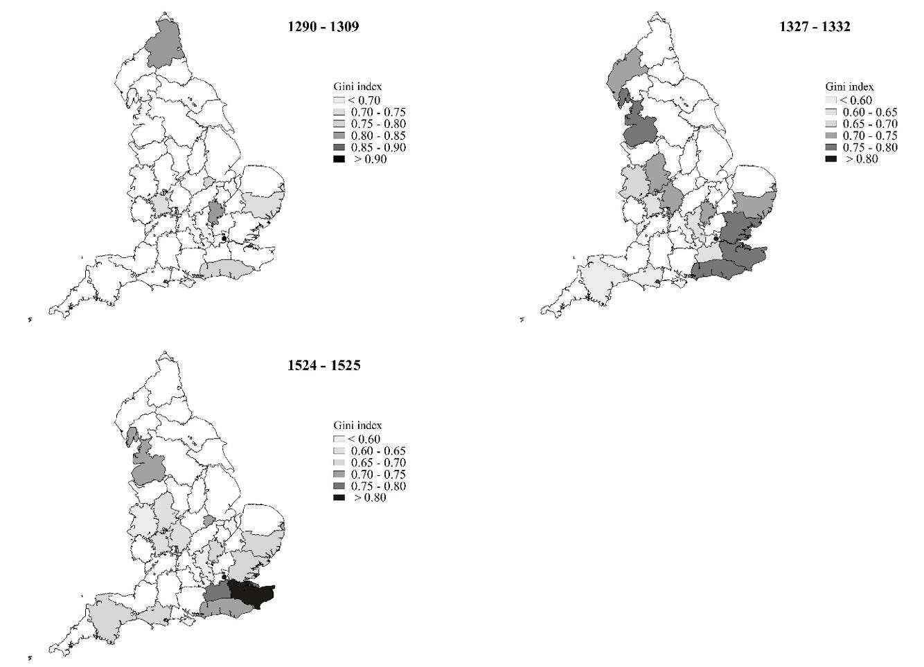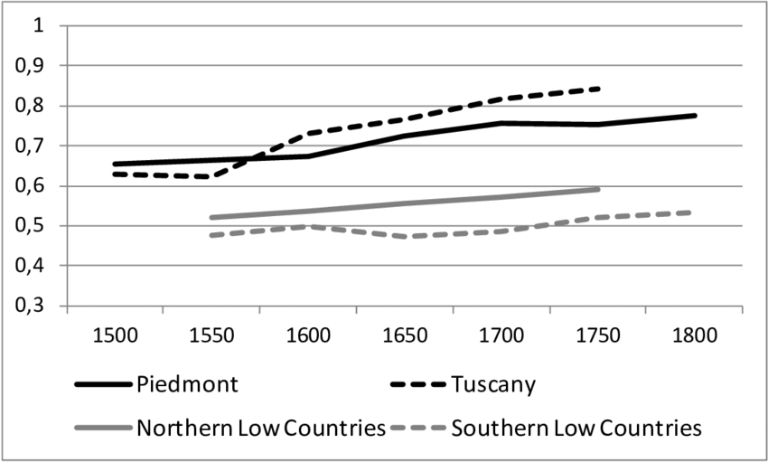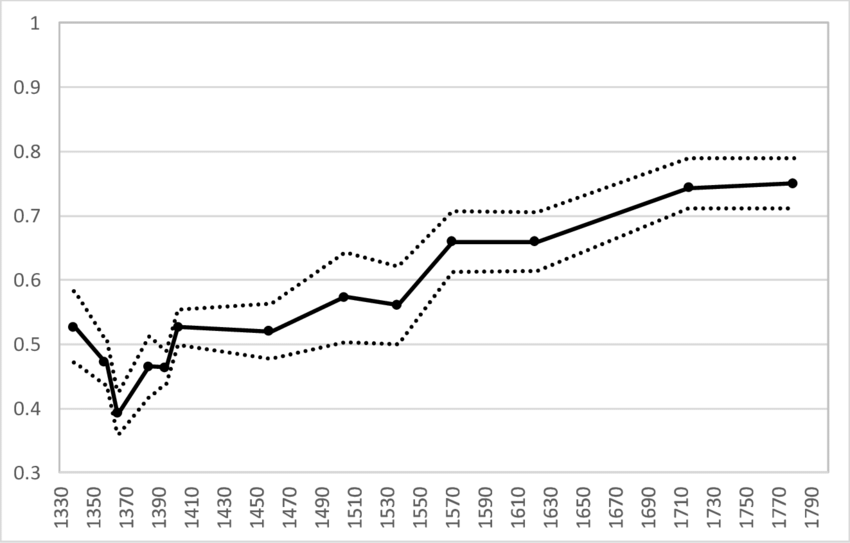 From what I gather, the norm for the Gini coefficient for income before the industrial revolution was about 0.2 to 0.7 — 0.5 in 1300-1500 Tuscany, 0.7 in 1500-1700 Tuscany, 0.7 in 1500-1700 Appalachia, 0.5 in 1500-1700 low countries, ~0.7 in Medieval Britain, 0.2 in the Roman Empire, 0.1-0.4 in Neolithic Near East, 0.2-0.6 in the Bronze Age Near East, and 0.1-0.3 in the Iron Age Near East.