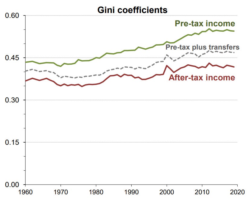 This can change depending on methodology, for example, the rise in inequality within the USA post 1960 is mostly attenuated when transfers and taxes are taken into consideration.