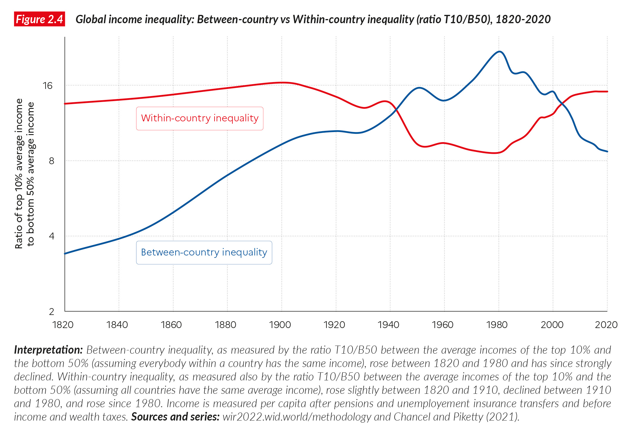 I would expect that Gini inequality globally has slightly reduced due to the welfare state, but the world GDP per capita has since skyrocketed — it went from $1,500 in 1820 to $20,000 in 2023, so overall inequality has increased by about 10x ever since the industrial revolution.