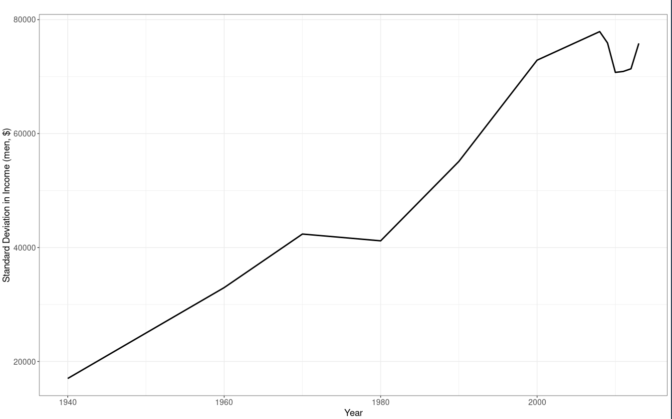 The standard deviation in income for men in 1940 was $1027, while in 2013 it was $75836. I attempted to test whether this held after adjusting for inflation using the BLS’ CPI inflation calculator, and it did, though the increase in inequality is far smaller: an increase of 4x rather than an increase of 75x.