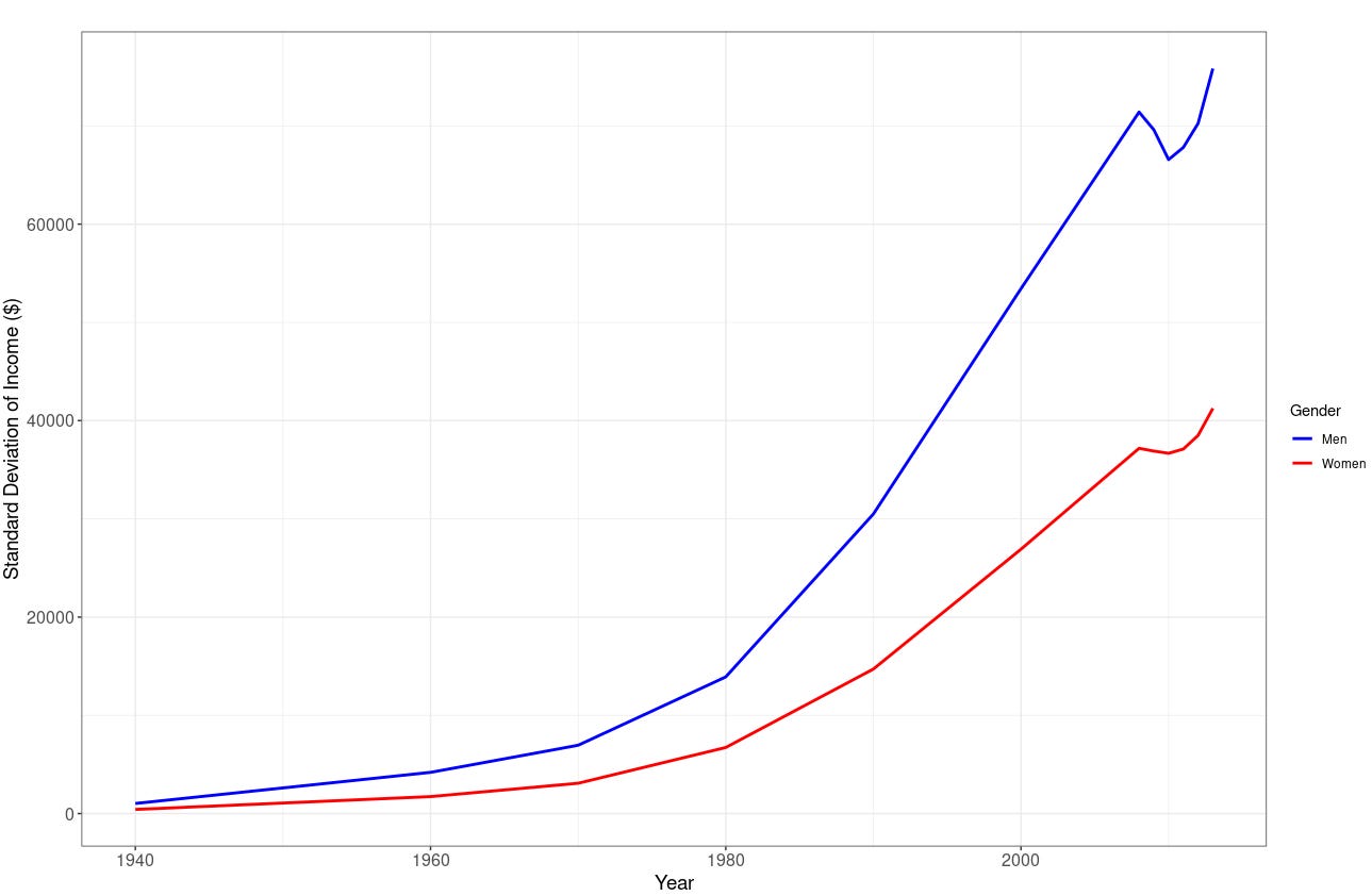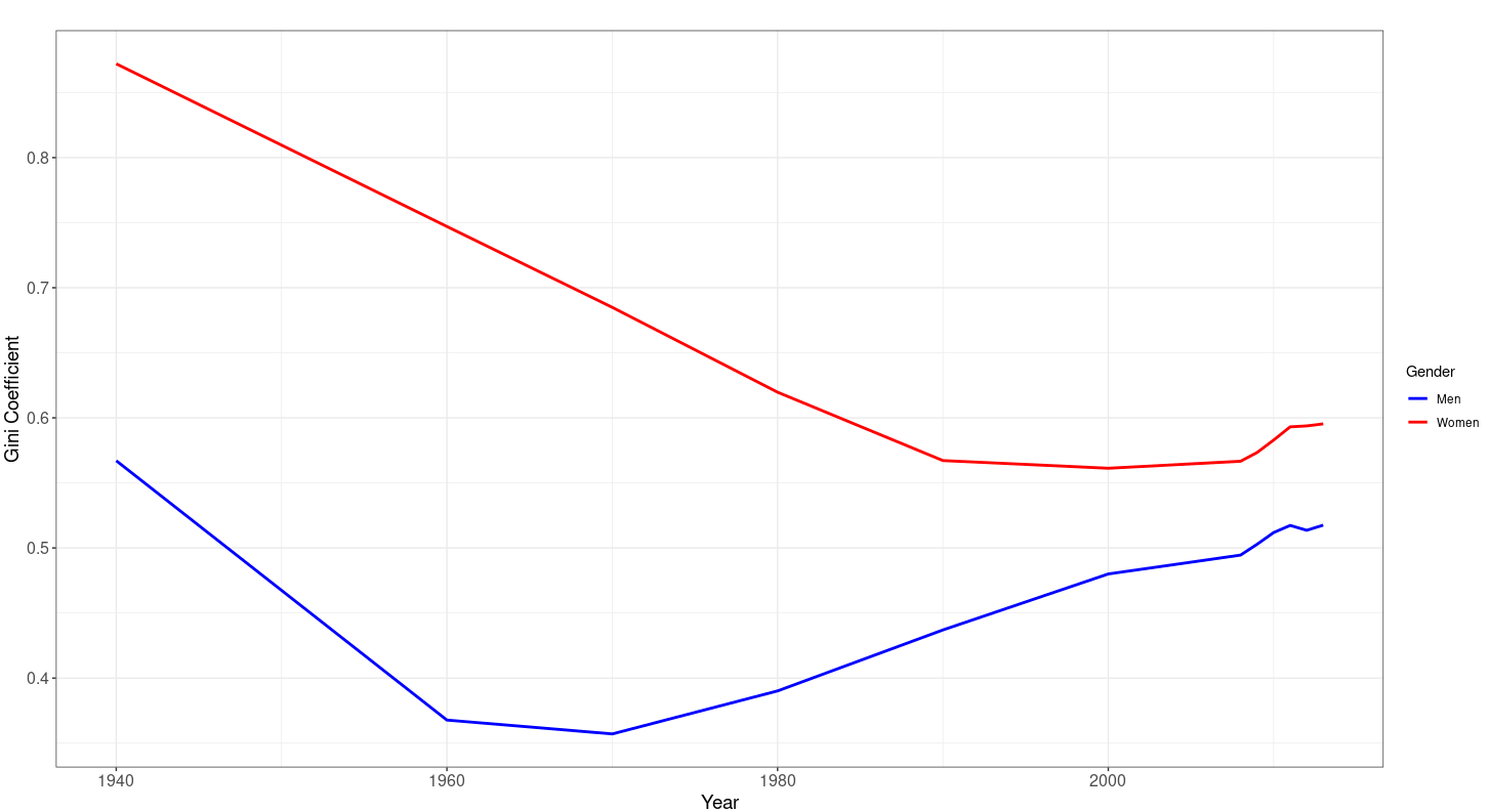 According to the Gini coefficient, income inequality decreased massively within women, probably due to an increased presence of women in the workforce, while inequality within men dropped from 1940 to 1970 and increased thereon afterwards. Overall fairly moderate changes, especially when you focus on the male data.