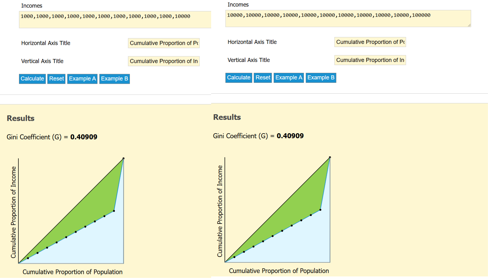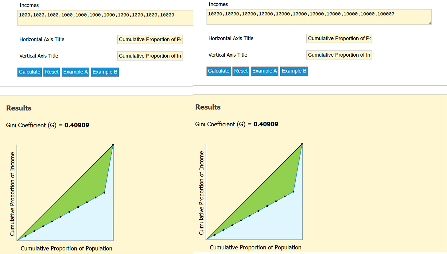 But not the same level of absolute economic equality. In society A, the richest person of the 11 can buy 12 models of the latest iphone while his poorer companions can afford only 1. In society B, the poor people can buy 12 iphones while the richest person can buy 125. In society A, that’s a difference of 11, while in society B, it’s a difference of 113.