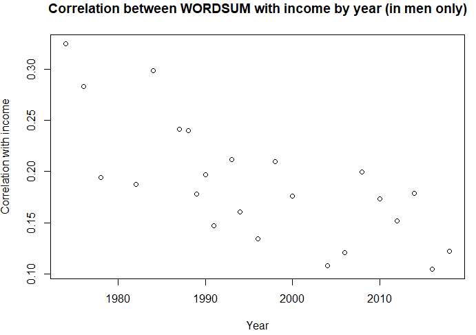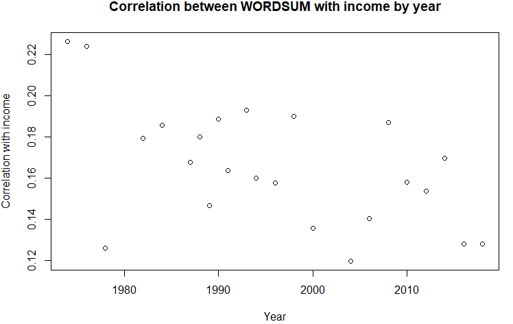 It’s possible that this is because the validity of the wordsum itself is declining; lots of the words on the test are outdated and not used by the younger generations. The words ‘keyed’ or ‘transmaxxing’ will not be seen in a 20th century vocabulary test — hopefully not in a 21st century equivalent either. By observing whether the correlation between income and wordsum changes as well, the degree to which this relationship generalizes can be tested as well.
