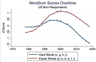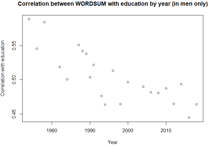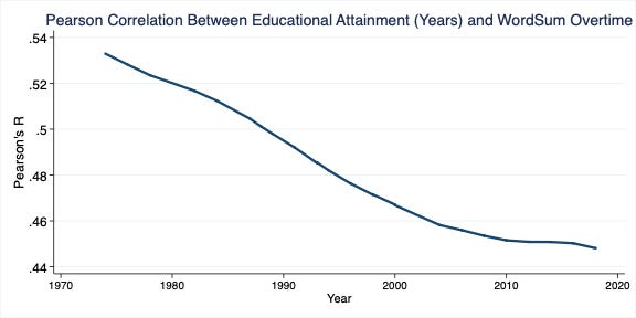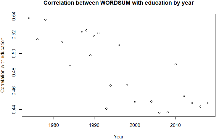 On the other hand, Zach Goldberg’s analysis of the GSS suggests that the correlation between educational attainment and wordsum score is steadily decreasing, and that the average score on the wordsum is decreasing as well: