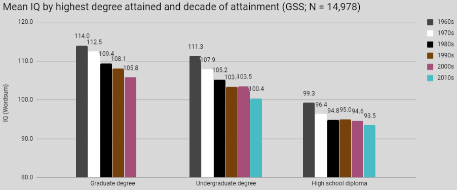 Others, such as Audacious Epigone, have found that the IQ scores within educational degree cohorts have been decreasing: