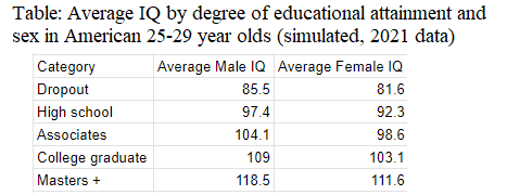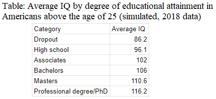 I used the same simulation technique to calculate IQ scores by degree using more detailed data from 2018, and came to this conclusion: