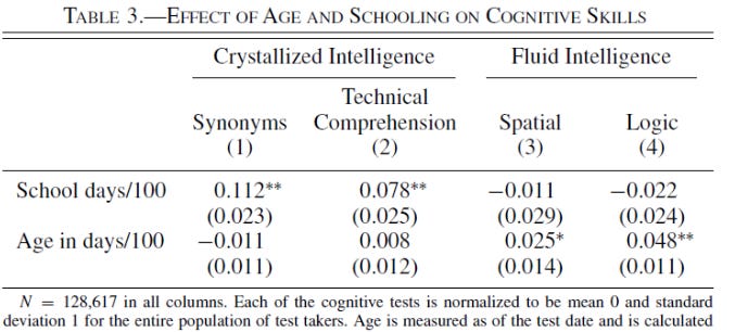 Reviews of the literature surrounding the relationship between educational attainment and intelligence suggest that educational attainment improves scores on scholastically related tests, but not other tests (Hu, 2022). The best study Hu cited was one that exploits random variation in the age at which students are recruited into the Swedish military, and relates their age to the scores on the military entrance exam. Independent of age, school days increased scores on synonyms and technical comprehension, while biological age was associated with higher scores on spatial and logic subtests independent of school days (Carlsson, 2015).