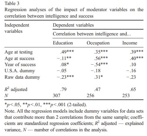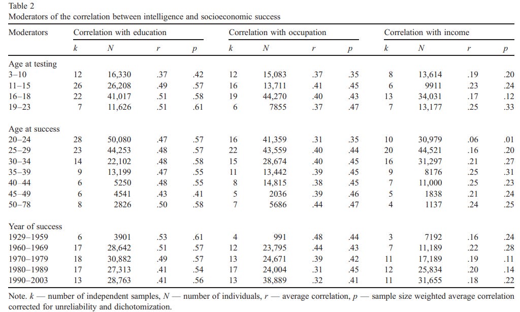 Here is Strenze’s table of moderators in his meta-analysis of success and IQ: