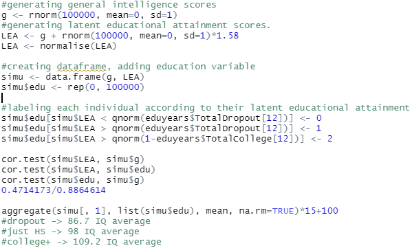 Currently, I only have longitudinal data regarding high school and college completion rates, so I can only simulate the results of 3 categories — dropouts, HS degrees, and college degrees. Based on the NLSY97 data, the correlation between IQ and education decreases to .47 when you use 3 categories instead of 6, which must be taken into account.