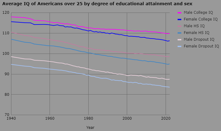 The educational attainment time series data was broken down by sex, so I took the liberty of breaking the results by sex. Most modern test IQ test batteries yield a sex difference of 4 points in adults; in this simulation I assumed a difference of 3.3 points. When the simulations for every single year were executed, these were the results: