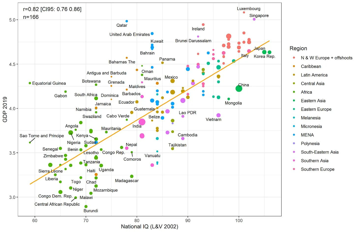 He skips over the weak arguments against immigration (e.g. that they lower wages, bring bad cultures, cause budget deficits) and instead tackles the strongest argument for restricting it, which is that national IQ is associated with GDP per capita. National IQ is clearly the causal variable behind this association, though Hanania seems to take this as a given.