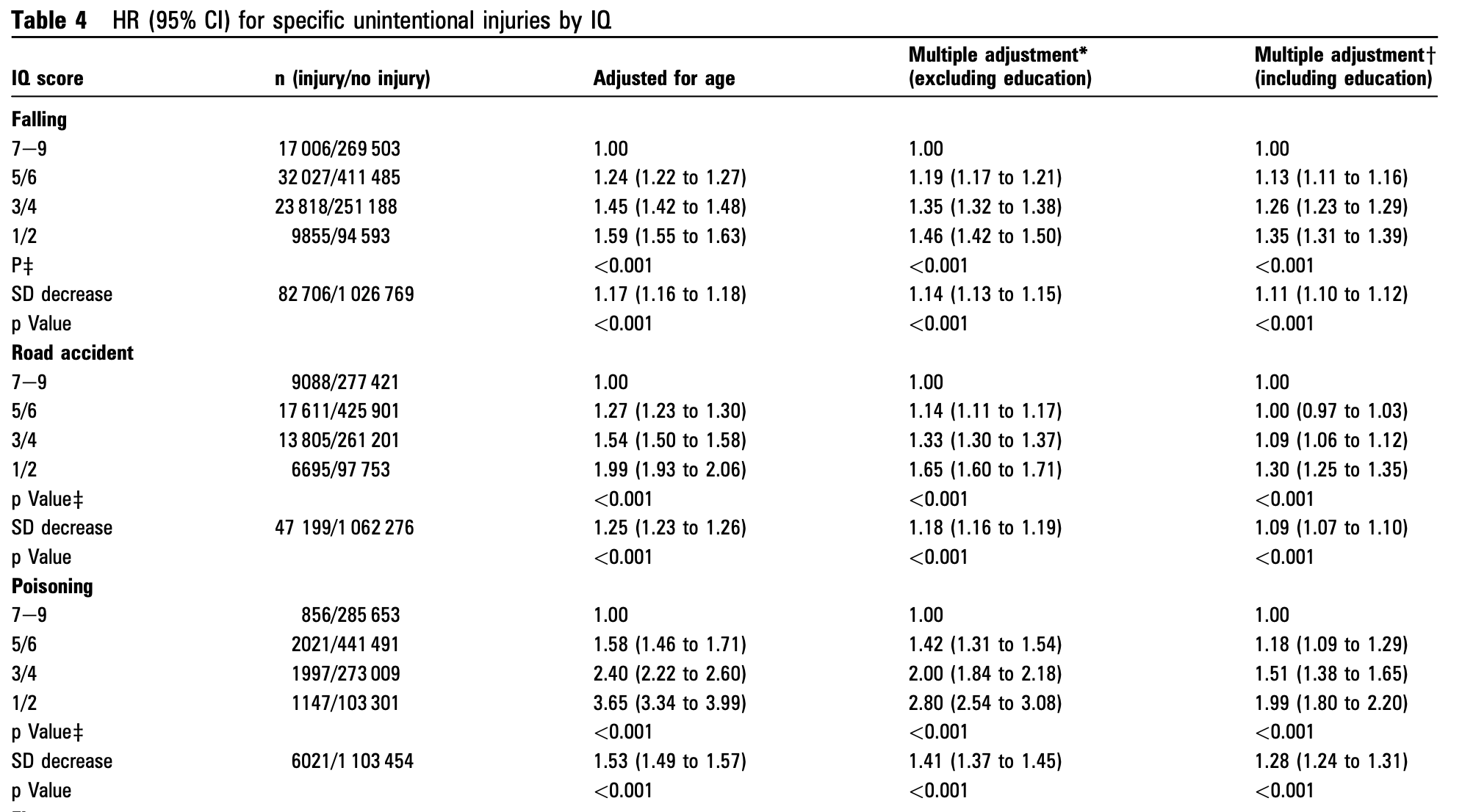 On an individual level, more intelligent individuals get into less accidents across the board, even when you adjust for multiple confounders such as parental SES and adult SES. Because of this, a causal explanation is warranted.