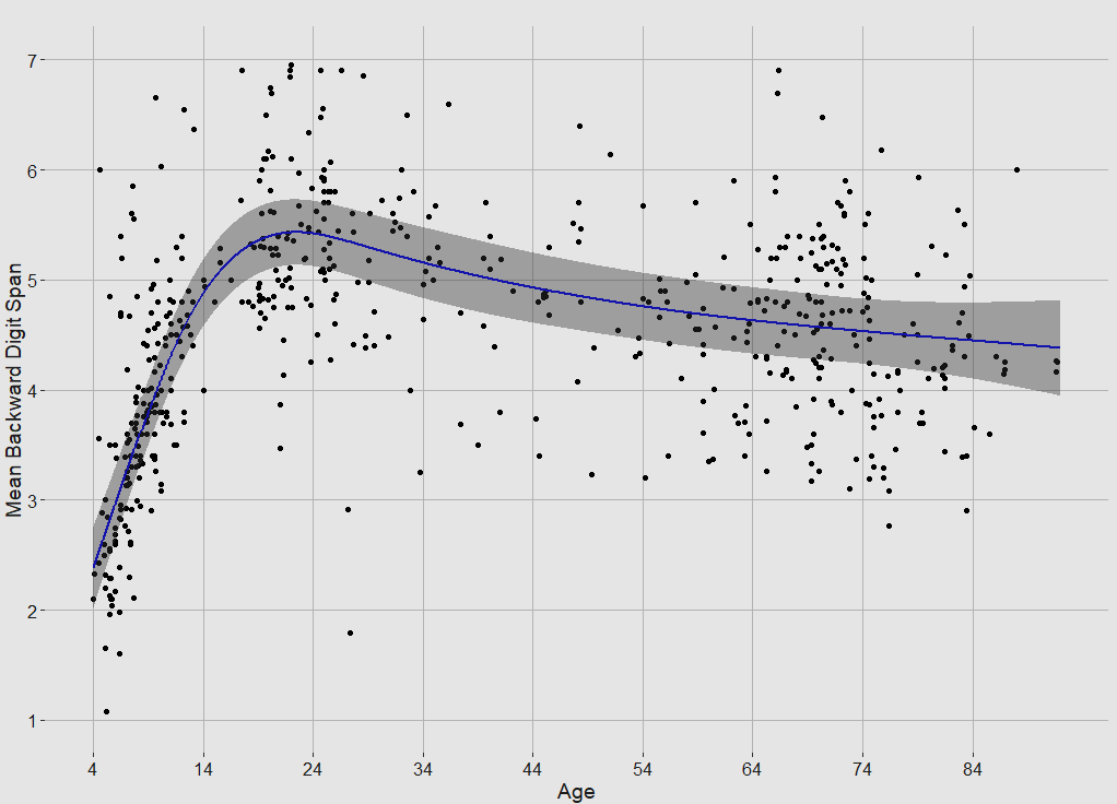 p <- splinechart(datos=subset, var1=’Age’, var2=’Mean’, knots=5, breakn=10, metastyle=F, label=’Age’, labely=’Mean Backward Digit Span’,