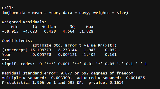 qwe <- lm(data=savy, Mean ~ Year, weights=Size)