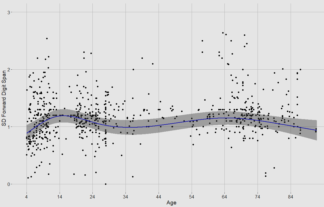p <- splinechart(datos=subset, var1=’Age’, var2=’SD’, knots=5, breakn=10, metastyle=F, label=’Age’, labely=’SD Forward Digit Span’,