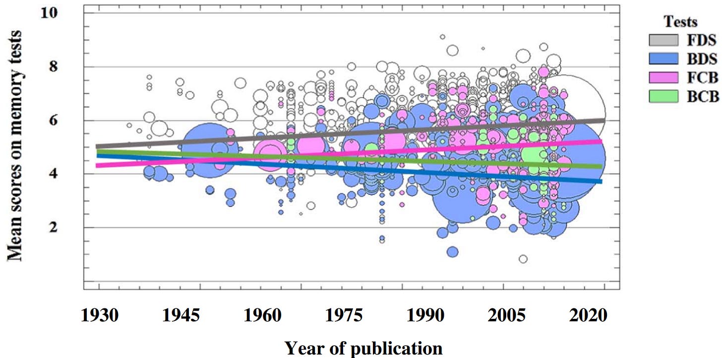 The Flynn effect has been investigated extensively for IQ, but few attempts have been made to study it in relation to working memory (WM). Based on the findings from a cross-temporal meta-analysis using 1754 independent samples (n = 139,677), the Flynn effect was observed across a 43-year period, with changes here expressed in terms of correlations (coefficients) between year of publication and mean memory test scores. Specifically, the Flynn effect was found for forward digit span (r = 0.12, p < 0.01) and forward Corsi block span (r = 0.10, p < 0.01). Moreover, an anti-Flynn effect was found for backward digit span (r = − 0.06, p < 0.01) and for backward Corsi block span (r = − 0.17, p < 0.01). Overall, the results support co-occurrence theories that predict simultaneous secular gains in specialized abilities and declines in g. The causes of the differential trajectories are further discussed.