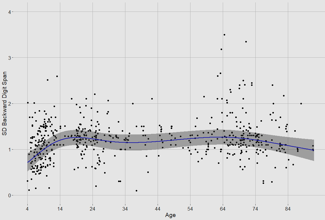 p <- splinechart(datos=subset, var1=’Age’, var2=’SD’, knots=5, breakn=10, metastyle=F, label=’Age’, labely=’SD Backward Digit Span’,