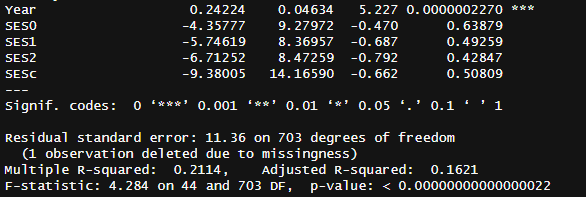 I was otherwise able to replicate the other coefficients in their model, like the intercept being 7.74 or the effect of country being 0.88, so I’m inclined to think the failure to replicate is not a function of small differences in underlying data or methodology. I was also similarly able to replicate the paramaters in their zero-order regression (16.11 and -0.01) but not the p-values and t-statistics2.
