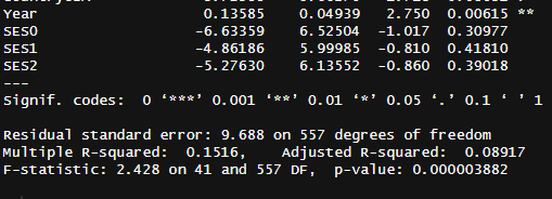 lr <- lm(data=subset2, IQ ~ Country + Year + SES)