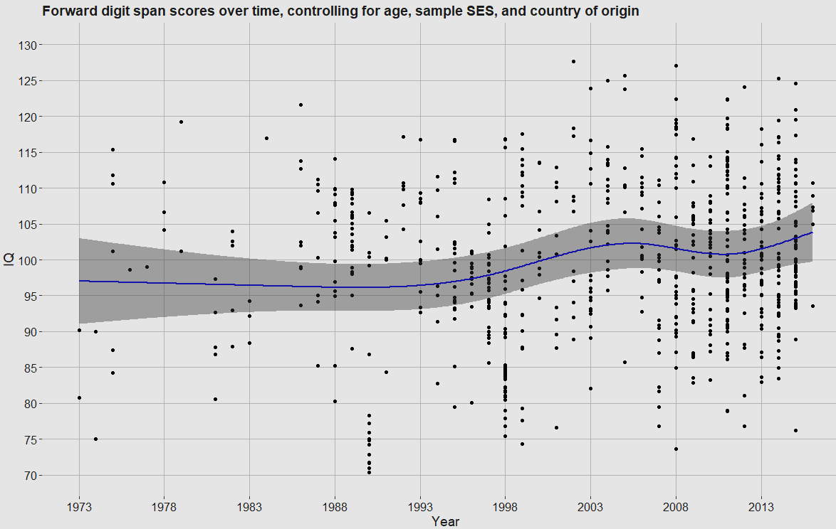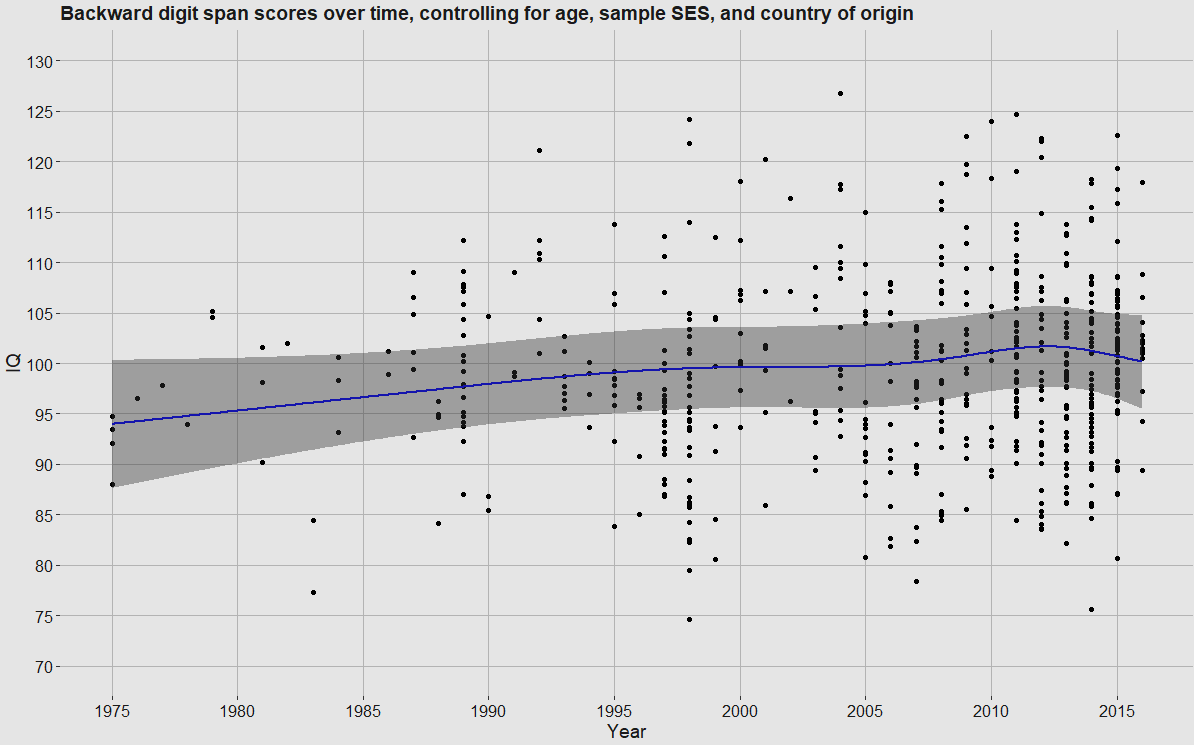 Fitting a spline to the data and controlling for age/SES/country3 suggested that backward digit span has increased by about 5.5 IQ points (41 x 0.13518) over the 1975 - 2016 time period. The effect was statistically significant4, but not to an impressive degree (p = .0063).