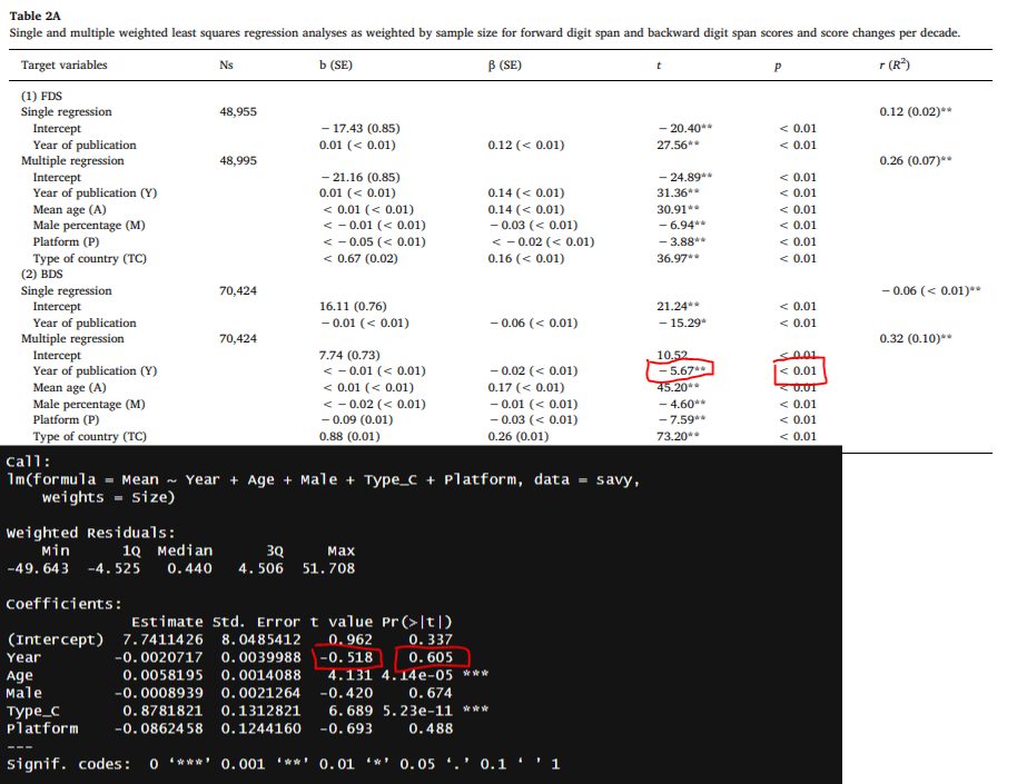 I identified one major error in a study on the Flynn Effect that I had frequently cited prior. It meta-anlyses performance on the number of digits one can memorise (digit span) forwards and backwards across time, finding that performance on forward digit span improved over time, but performance in backwards digit span worsened:
