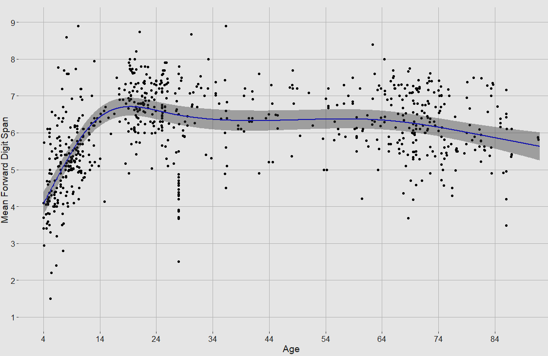 p <- splinechart(datos=subset, var1=’Age’, var2=’Mean’, knots=5, breakn=10, metastyle=F, label=’Age’, labely=’Mean Forward Digit Span’,