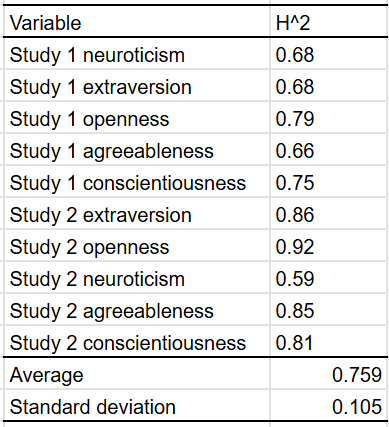 I compared the heritability estimates I estimated to those found by other researchers6 for the purposes of external validity. In most cases, my estimates agreed with that of the academic literature, with the exceptions of lifespan, personality, and BMI.