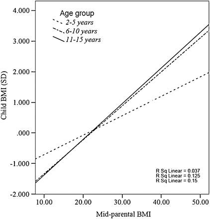 The midparent ~ child correlation (0.33) is lower in comparison to what would be expected from a heritability of 55%, but I suspect this is due to the genetic causes of BMI varying by generation and the sample in question being young; the correlation was closer to ~.4 in older children: