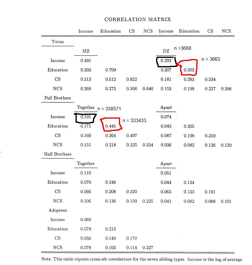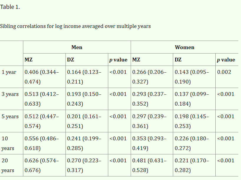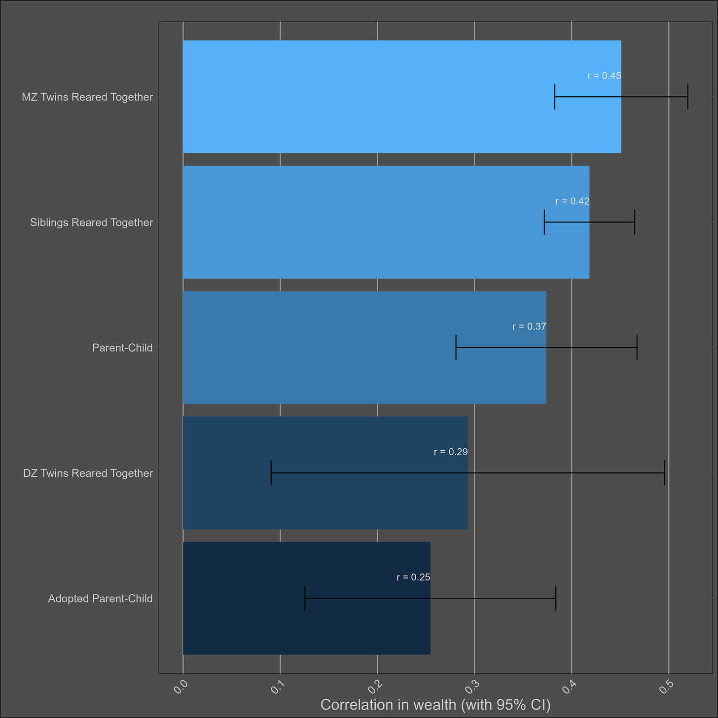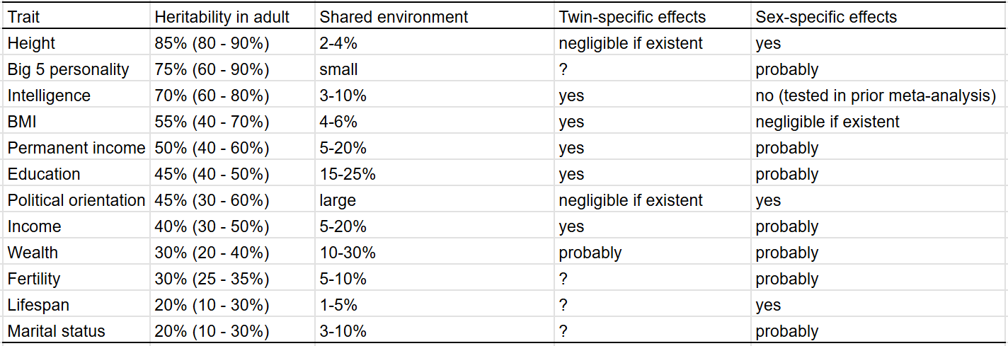 I’m reticent to give a low heritability estimate for wealth, as income is substantially heritable and financial decisions are as well. If the heritability is generously assumed to be 30%, that implies a shared environmental effect of 14% (based on DZ twins) to 27% (based on siblings). Although no twin-specific effect is observed, it certainly exists in real life, as twin-specific effects exist for income and education.