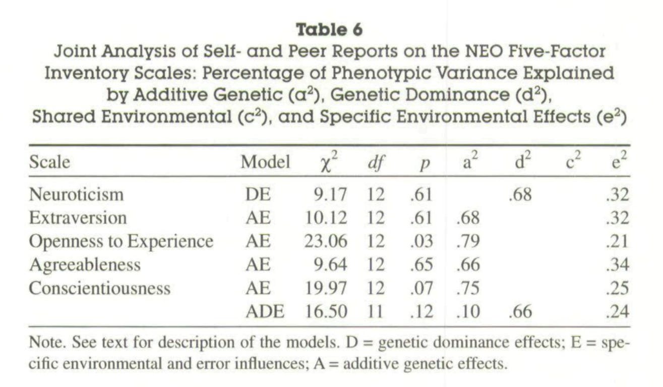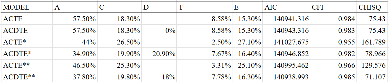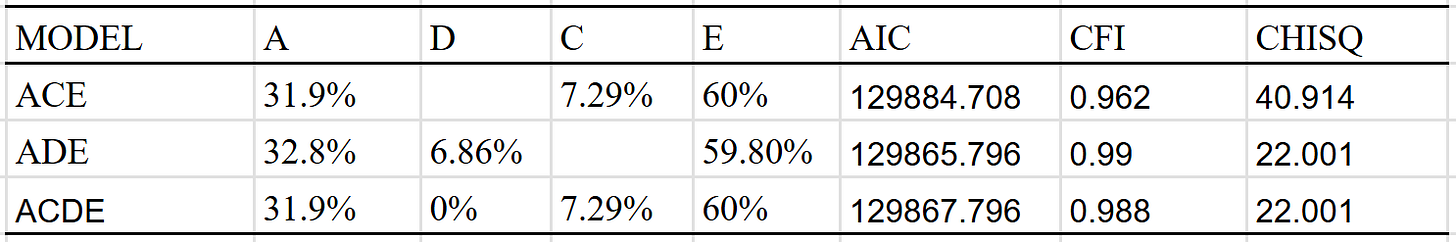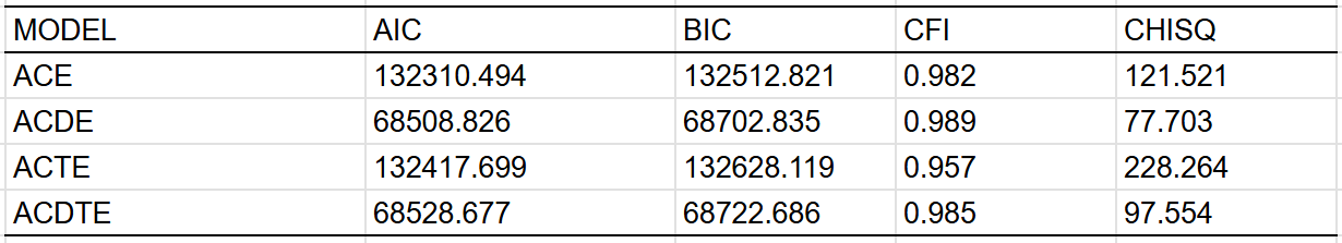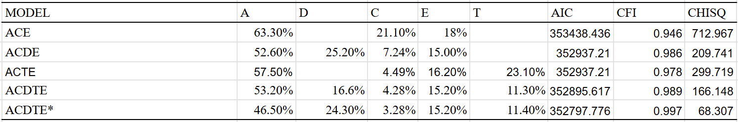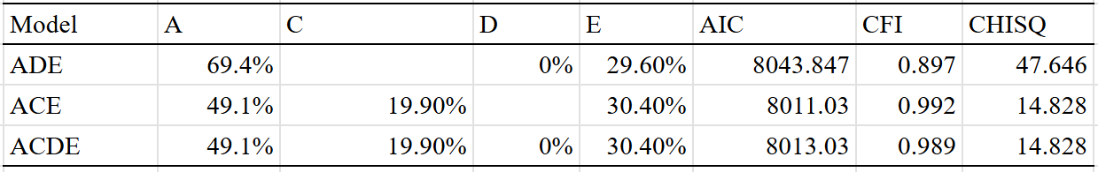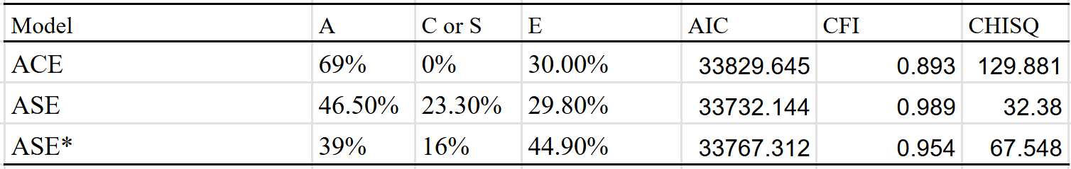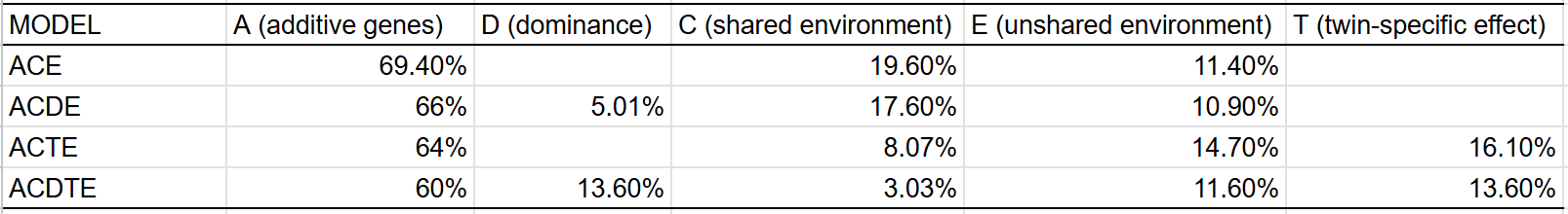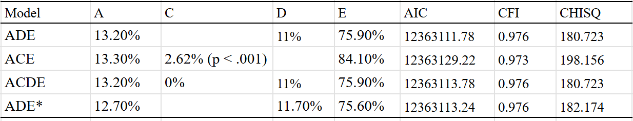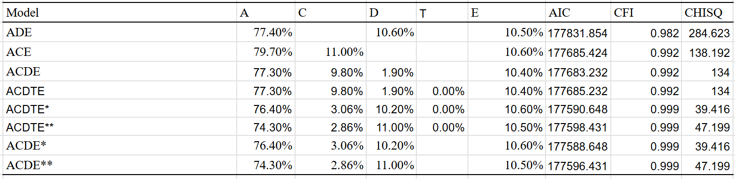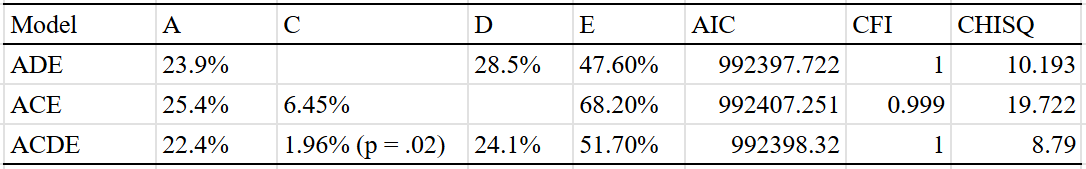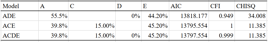 Best fit is the ACDE model that adjusted for assortment. Dominant variance was small, indicating that the results were trustable. The twin-specific effect is estimated to be zero, but I suspect that it exists to a minimal extent, even within adults.