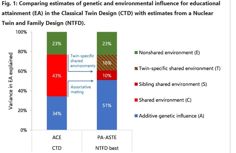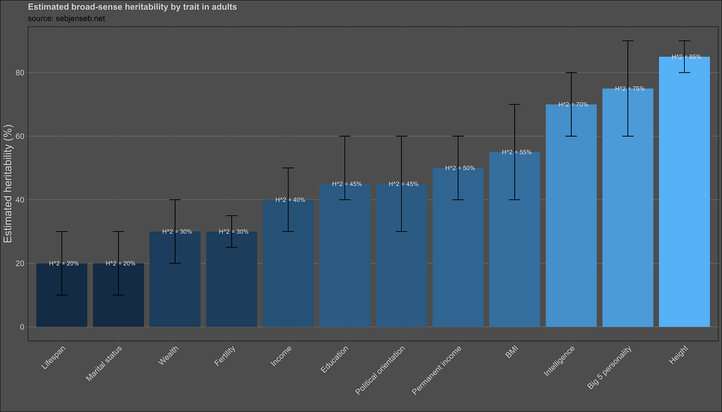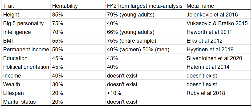 I found zero (0) evidence of phenotypic transmission from parent to child for every single trait except for political orientation, education, income, and wealth. In the case of political orientation, the effect is very large: about 5-10%4 of an individual’s political orientation can be explained by non-genetic transmission from a parent to their child; in the case of education, income, and wealth, these figures are 2%, 5%5, and 6% respectively. I suspect these effects are due to environmental confounding; the environments that parents grow up in correlate with those that their children grow up, so correlations between parents and children will be observed, even if they are not genetic or cultural in nature. The relationships are also coincidentally observed in traits with large shared environmental effects, which would be expected if the correlations were an artefact of environmental confounding.