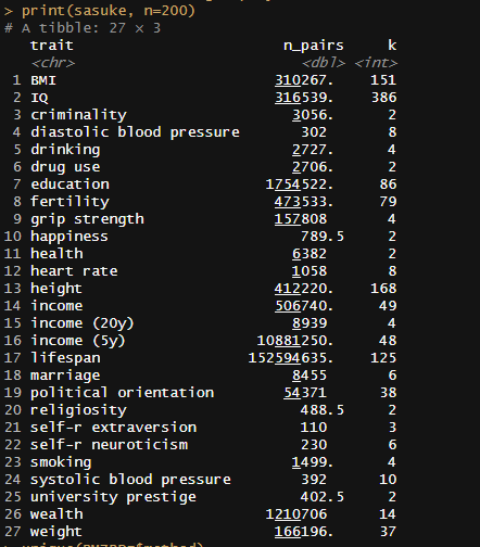 Between the Minnesota study of twins reared apart, Haworth’s meta-analysis of twin studies of intelligence, the Dutch twin study, Segal’s twins reared apart, Bouchard’s tables of correlations between family members in IQ1, Burt’s study of family members reared apart2, the Korean-American study of adoptees, the Brothers sample, Hyytinen’s meta-analysis of twin studies on income, Horwtiz’s meta-analysis of assortative mating, the Swedish Adoption/Twin Study of Aging (which I analyzed), Jelenkovic’s meta-analysis of twin studies on height, Hatemi’s meta-analysis of twin studies on political views, Elks et al meta-analysis of BMI, the Finnish study of twins reared apart, and dozens of other publications, I’ve assembled 1250 correlations between family members in traits, representing about 170,000,000 pairs of individuals. The dataset is available here3.