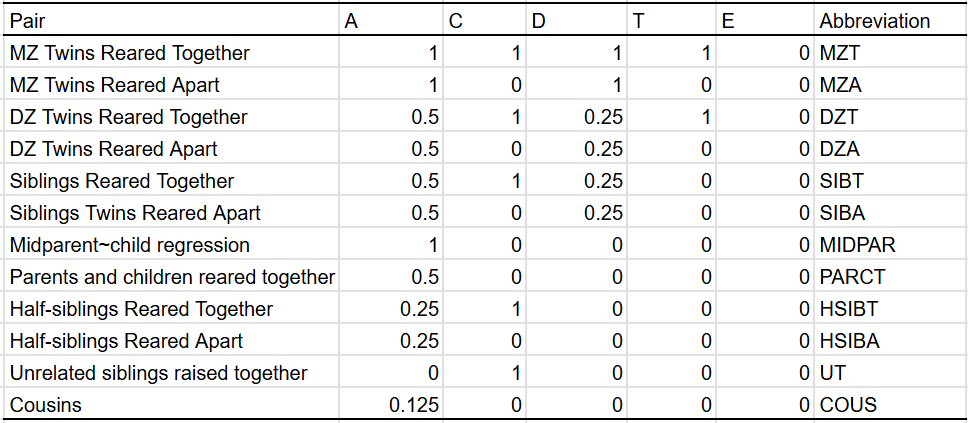 In most cases, I have the privileges of having many different types of family members, so I can plug them all into a statistical model that estimates a set of parameters. In the traditional twin model, these are A (additive genes), C (shared environment), and E (unshared environment). When appropriate, I estimate D (dominant genes) and T (twin-specific effects). These are the similarities between family pairs in each component: