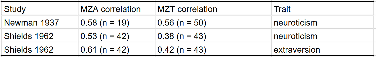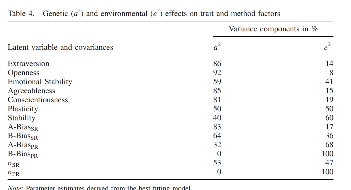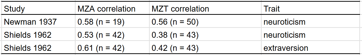 Very large twin-specific effect here — DZ twins correlate at 0.46 and siblings correlate at 0.3. Twins reared apart are less similar than those reared together, though this is hardly the case for other kin pairs. In the American adoption study of Korean children, there was no correlation between adopted parents and children, and a correlation of .11 (n = ~900 pairs) in genetically unrelated adult siblings.