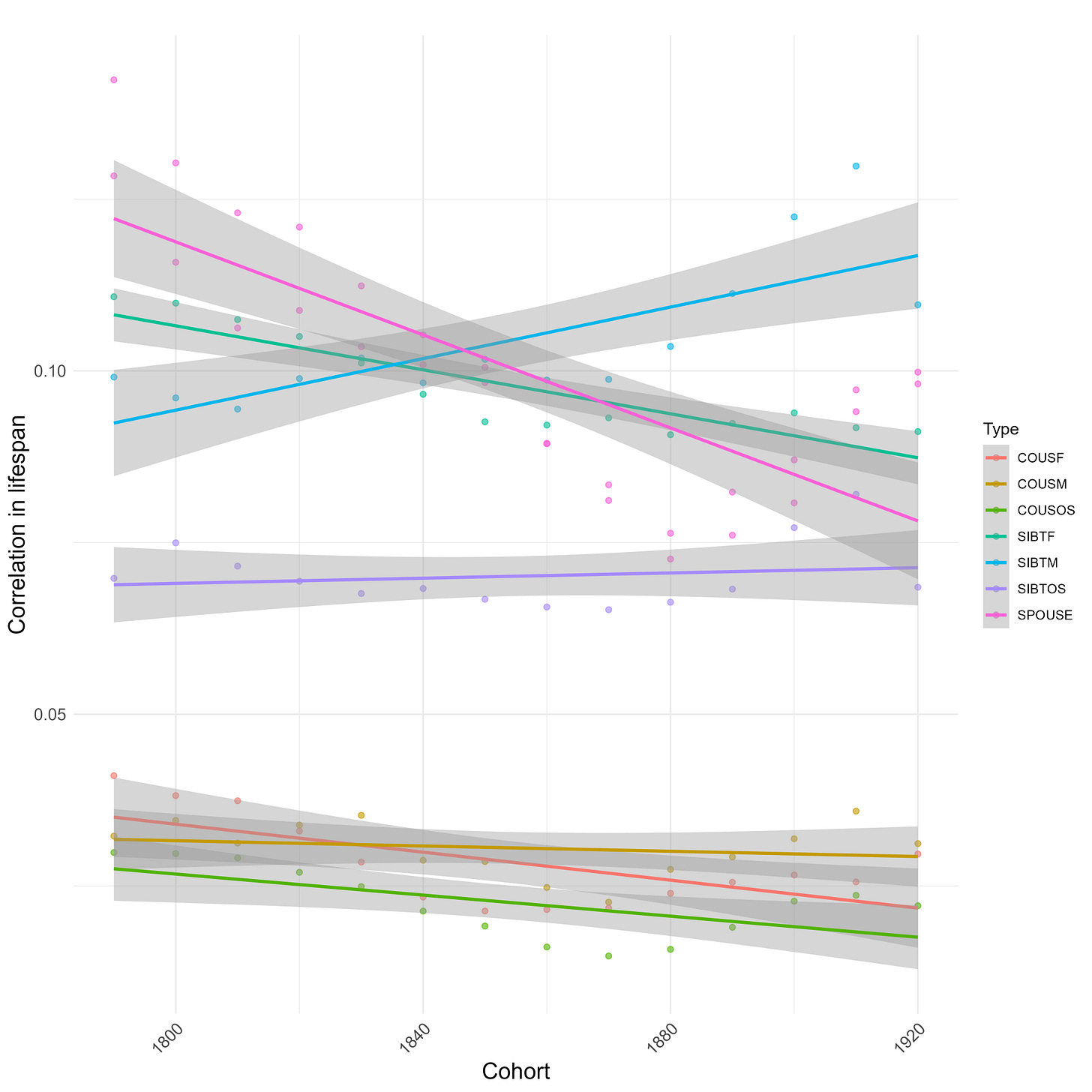 Within the last 200 years, the correlation between male relatives in lifespan has increased, while the correlation between female relatives decreased: